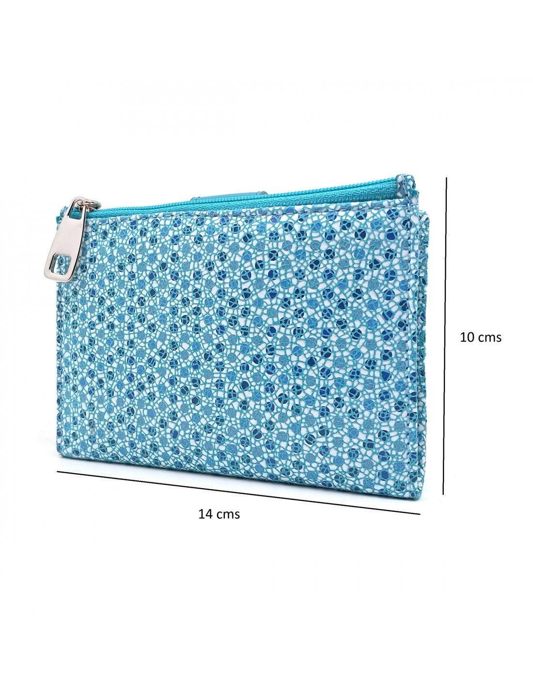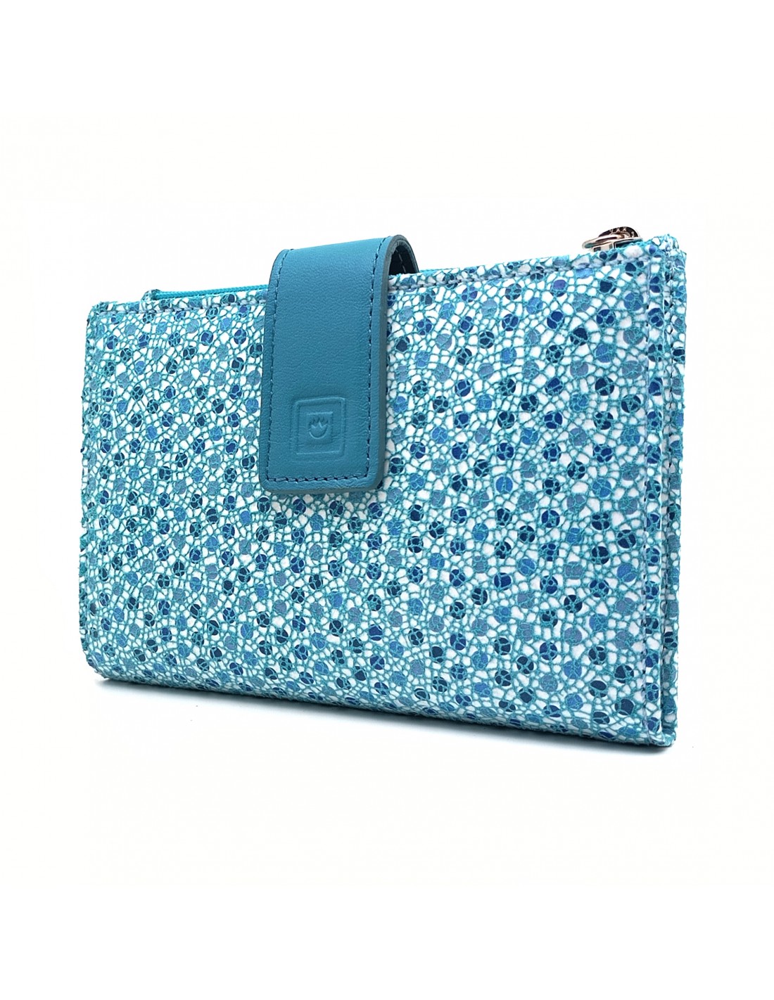 Monedero Billetera en Piel Para Mujer con cremallera,  Tamaño Mediano, MELISA azul estampado y solapa