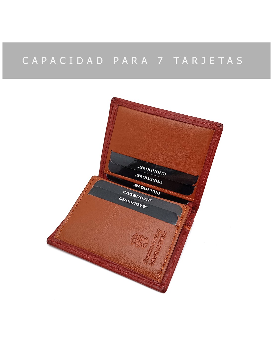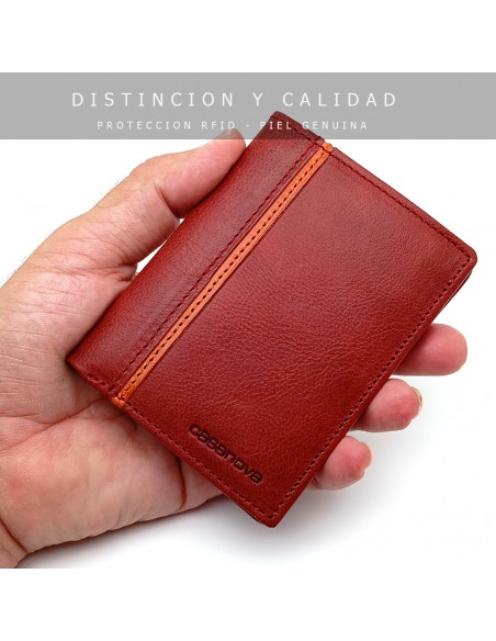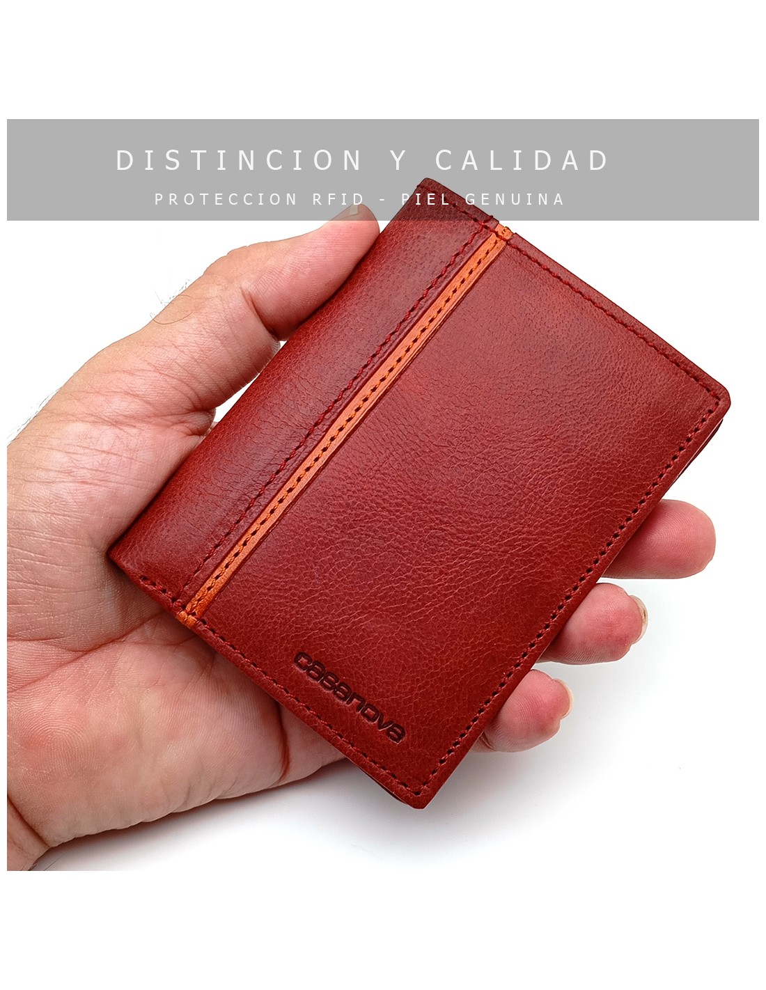 Compacta, elegante y funcional, con capacidad para hasta seis tarjetas, doble ranura para billetes y protección RFID. Viene presentada con etiqueta y caja. Disponible en azul o burdeos. Medidas aproximadas: 10,5 × 8 cm. Elige practicidad con estilo.